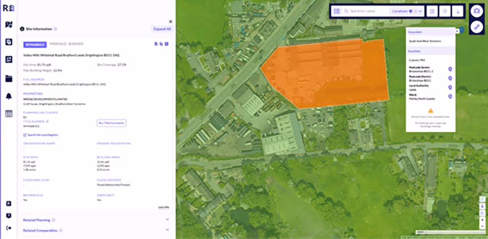 Taking the below example in Leeds, we can see this visually meets the criteria of a potential grey belt; classified as Green belt of South and West Yorkshire, but already developed as a parking lot (a brownfield site). You can also instantly access all details on site size, coverage and most importantly, ownership. So far, so good.