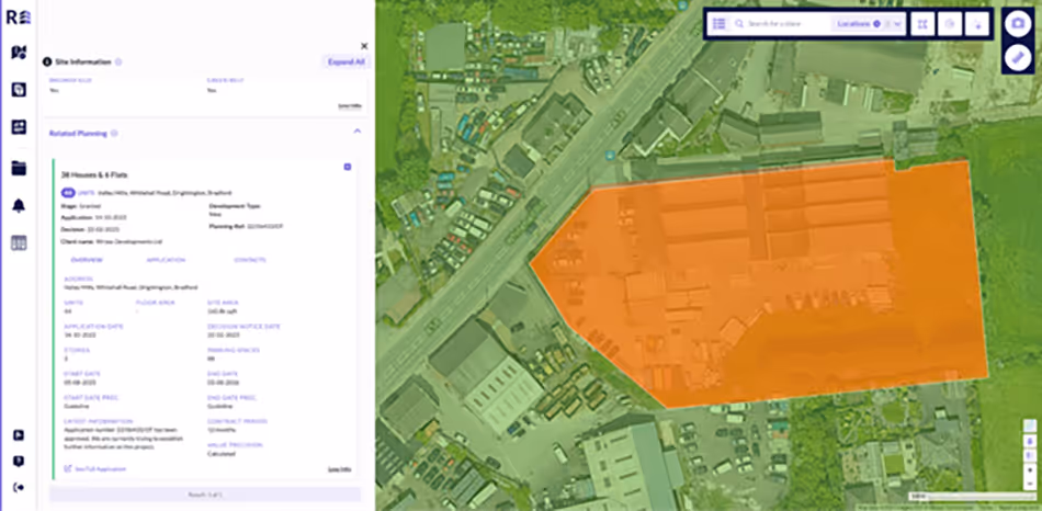However, we’re able to take it one step further and understand if there is any associated work already planned for this site, using our “related planning” option. As the below image shows, there’s actually already planning granted on this site. So, not only can you identify potential opportunities, you can quickly refine your findings to those that are relevant and warm leads.